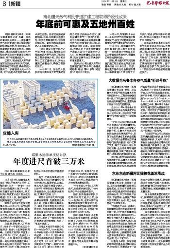 据悉,南北疆天然气利民管道扩建工程目前完成年度目标建设任务1000多公里。后续,察布查尔锡伯自治县管道和博乐—温泉管道2个项目将于11月投产,塔城、伊犁州清水河、精河—阿拉山口管道3个项目将于12月底投产。