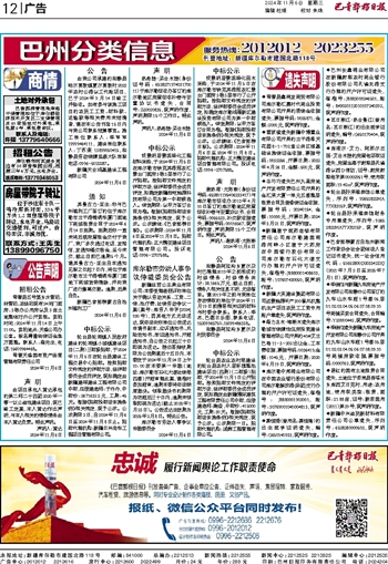 广告中心:2012012 2212616 发行中心:2212600 2022499 月价:24元 年价:288元 印刷:巴州日报印务有限责任公司 电话:2024204
