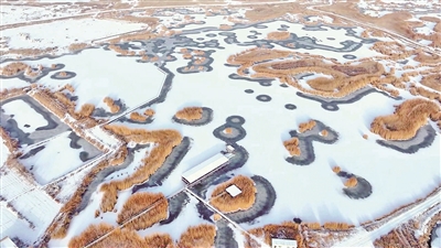 隆冬时节,和硕县龙驹湿地银装素裹,在芦苇丛的周围,一片片“冰荷叶”绽放在冰雪覆盖的湖面上,奇幻又壮观(12月28日摄)。