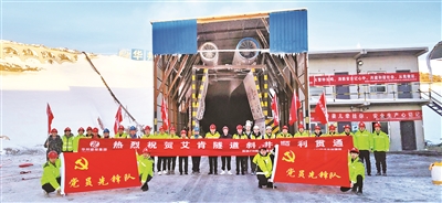 2024年12月31日,艾肯隧道1180米斜井贯通。图为建设者们在斜井洞口拉起横幅庆祝。通讯员 高建峰 摄