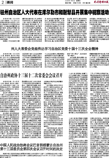 会议强调,要依法履职、担当作为,抓实抓好人大立法、监督、代表等工作,推动人民代表大会制度优势更好转化为治理效能,推动全会精神落实落地。要围绕中心、服务大局,锚定“在南疆高质量发展中挑大梁、作表率”使命任务,进一步激发各级人大代表、人大干部履职担当的内生动力,凝聚团结奋进力量,助力高质量发展、全面深化改革等重点任务在巴州落地见效,为推进中国式现代化巴州实践作出人大贡献。