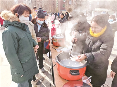 2月10日,库尔勒市建设街道千城·梨香水韵小区中心小广场上,千城社区干部在为群众分发汤圆。(本报记者 陈新 摄)