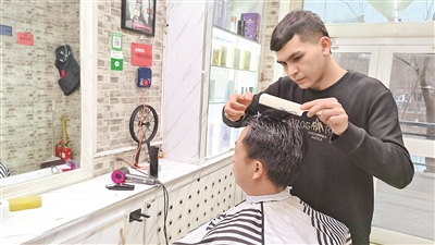 2月23日,阿迪力·阿卜杜吾普尔在给顾客理发。本报记者 杨柳青 摄