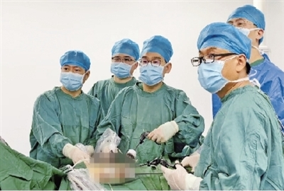 铁门关市人民医院外科主任孔斌(左三)在为患者行腹腔镜下手术。