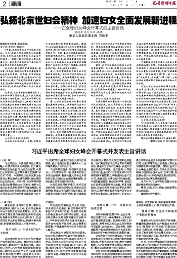 全球妇女命运与共。当前,实现妇女全面发展仍然面临复杂挑战。据统计,全球尚有超过6亿妇女和女童深陷战乱冲突,约10%的妇女和女童生活在极端贫困之中。同时,暴力和歧视痼疾难消,性别数字鸿沟加大,实现男女平等任重道远。展望未来,我们要重温北京世妇会初心,为加速妇女全面发展新进程凝聚更广泛共识、开辟更广阔道路、采取更务实行动。在此,我提4点建议。