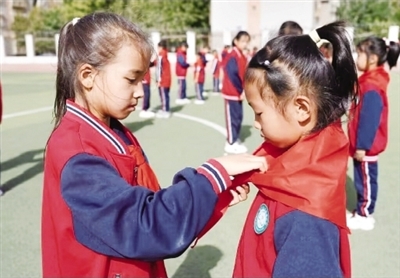 老队员为新队员佩戴红领巾。本报记者 袁海军 摄