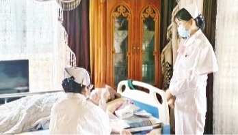 近日,库尔勒市医共体第一人民医院院区乳腺肿瘤科创新推出PICC导管上门维护服务。图为乳腺肿瘤科护理团队在患者家里进行导管冲管、封管、敷贴等维护服务。