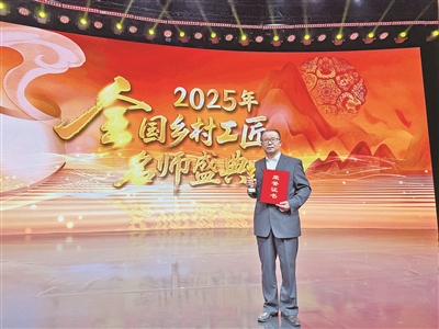 根登加甫在全国乡村工匠名师盛典上领奖。和静县委宣传部供图