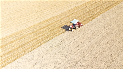 11月3日,在河南省商丘市睢县河集乡小杨庄村一处农田内,农机手驾驶播种机播种冬小麦(无人机照片)。