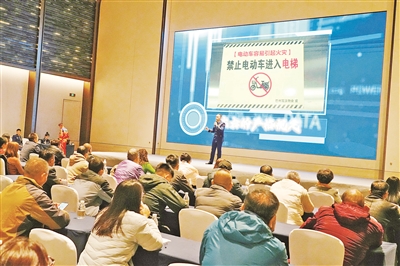 11月11日,2025年新疆消防“天山蓝焰”科普宣传行活动走进巴州。图为宣讲员在宣讲电动车禁入电梯相关知识。本报记者 廖军 摄