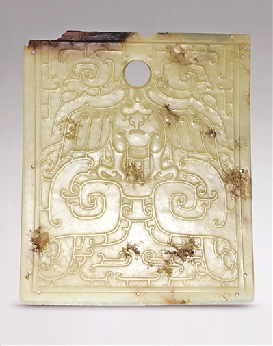 这是陕西榆林石峁遗址墓葬出土的鹰纹玉钺(正面)(资料照片)。新华社 发(国家文物局供图)