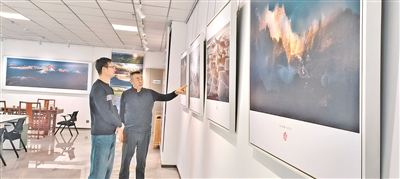 马立新(右)向参观者介绍工作室展出的摄影作品。