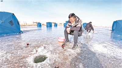 博斯腾湖莲海世界景区冰封湖面上,游客在进行冰钓。