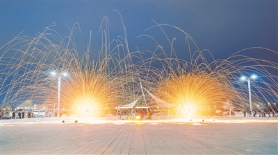 12月26日晚,非遗打铁花和千年火壶表演在库尔勒市鸿雁广场举行。火树银花点亮夜空,市民和游客沉醉其间,沉浸式感受中国传统民俗的独特魅力。本报记者 陈飞 摄