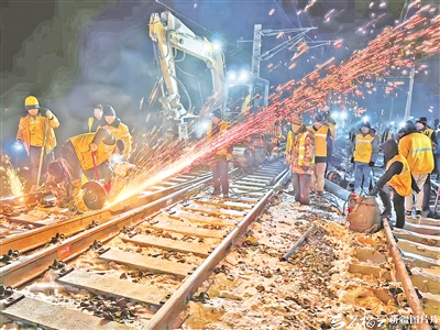 近日,中铁十五局集团建筑装配科技有限公司承建的红旗镇铁路专用线接轨站改造工程顺利完成。该工程精准对接胡杨河经济技术开发区煤炭运输需求,改造完成后将大幅提升运输效率、降低物流成本。图为工人正在进行道岔拆除作业。