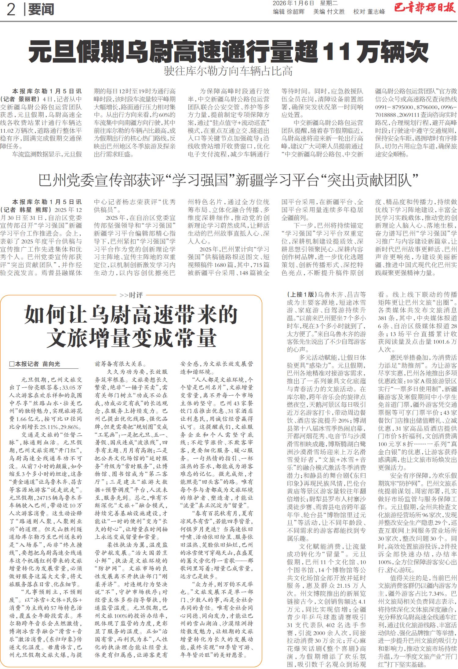 元旦假期乌尉高速通行量超11万辆次