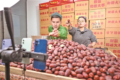 春节临近,新疆特色年货迎来销售旺季,和田薄皮核桃、红枣等农特产品,成为全国消费者置办年礼的热门之选。和田地区电商企业借力直播带货、网上年货节,向全国推介优质好物。各地提前备足货源,优化物流配送全链条,实现从接单到发货的快速响应。新华社记者 丁磊 摄