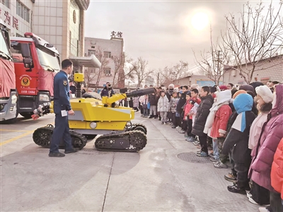 冬日寒气袭人,大家参观学习的热情却丝毫不减。一进营区,几辆红色消防车停在路中央,车身上“消防救援”的大字格外醒目。最吸睛的是一台黄色救火机器人,在消防指战员的操控下灵活转向、前进。科技感十足的演示让孩子们大开眼界,真切感受到科技的魅力。