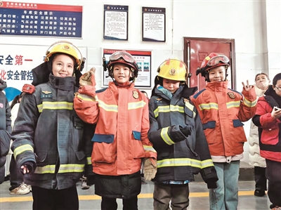 装备体验环节让孩子们激动不已。6名被挑选的幸运小记者,在消防指战员帮助下穿上厚重的消防服、戴上头盔。刚穿戴整齐,孩子们就忍不住喊:“好重呀!”他们真切地体会到了消防指战员工作的艰辛。随后,在牛海亮的组织下,消防指战员演示了滑杆科目,从二楼平台瞬间平稳落地,干净利落的动作让小记者们惊叹不已,现场响起热烈的掌声。