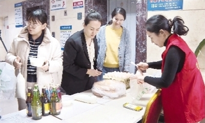 在库尔勒市社保中心,前来办事的群众在直销点购买农产品。
