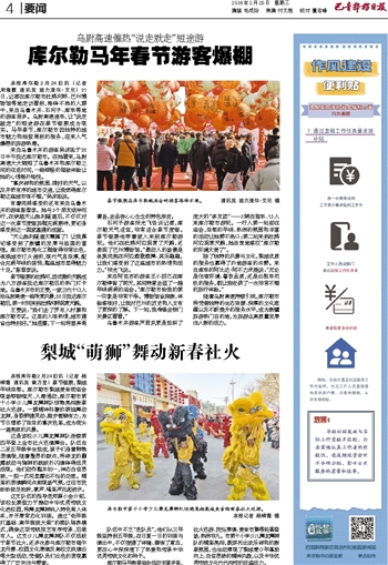 本报库尔勒2月24日讯 (记者 周海霞 通讯员 迪力亚尔·艾尼) 21日,记者在库尔勒市杜鹃河畔、巴州博物馆等地走访看到,络绎不绝的人群中,来自乌鲁木齐、石河子、库车等地的游客居多。乌尉高速通车,让“说走就走”的短途游在春节假期成为现实。马年春节,库尔勒市因独特的城市魅力和细致周到的服务,迎来人气爆棚的旅游热潮。