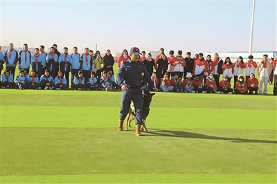 近日,若羌县公安局特警大队举办“警营开放日”主题活动,邀请辖区师生代表走进警营参观体验。活动现场,特警队员向师生展示警犬实训技能,通过沉浸式互动拉近警民距离,强化师生法治观念和意识。文/通讯员 史博 图/通讯员 成浪浪