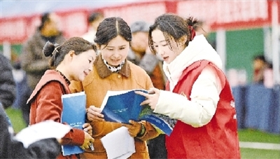 2月25日,在湖北省襄阳市保康县“春风行动”大型招聘会现场,工作人员(右)向求职者介绍用工信息。