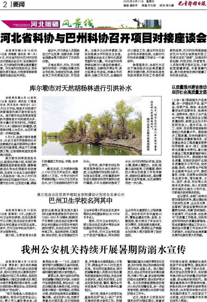 - 我州公安机关持续开展暑期防溺水宣传 本报库尔勒8月10日讯 (记者 景丽君) 连日来的高温天气,使群众户外涉水活动增多,我州公安机关以夏季治安打击整治行动工作为契机,组织民辅警深入辖区旅游景点及周边水域开展暑期防溺水宣传,从源头预防