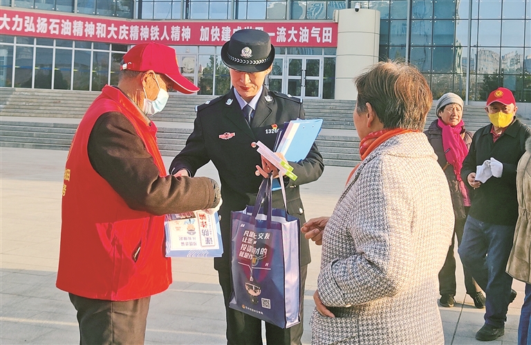 11月20日,库尔勒市康都街道塔里木油田社区联合辖区派出所开展反诈宣传,全力筑牢反诈“防火墙”,以实际行动守护居民的“钱袋子”。 通讯员 李玉梅 摄