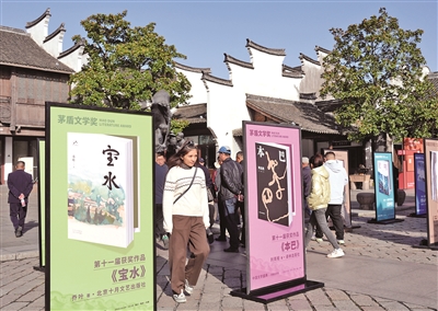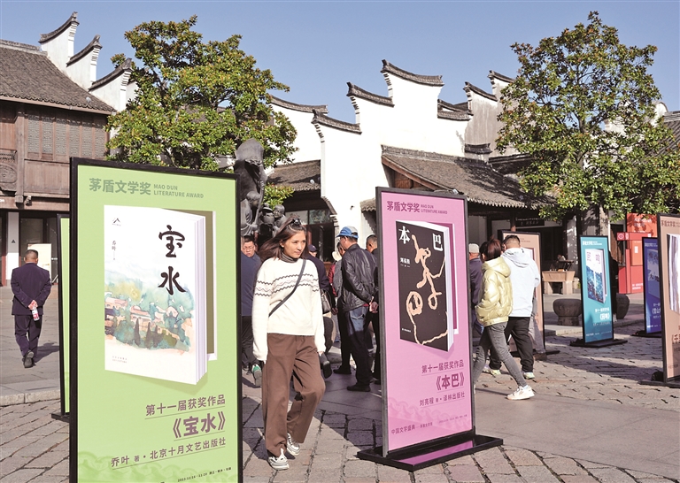 11月17日,人们从乌镇景区展示的茅盾文学奖获奖作品展板旁走过。