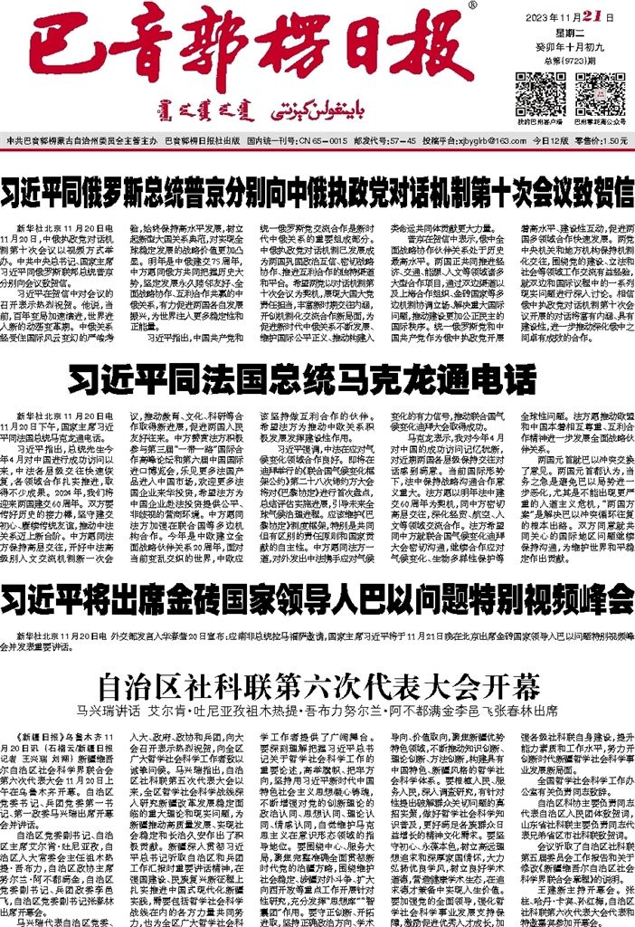 - 自治区社科联第六次代表大会开幕 《新疆日报》乌鲁木齐11月20日讯 (石榴云/新疆日报记者 王兴瑞 刘翔) 新疆维吾尔自治区社会科学界联合会第六次代表大会11月20日上午在乌鲁木齐开幕。自治区党委书记、兵团党委第一书记、第一政委