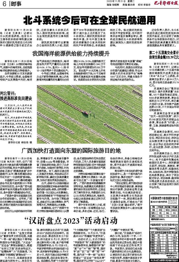- “汉语盘点2023”活动启动 新华社北京11月20日电(记者 史竞男) “全球文明倡议”繁荣世界文明百花园,共建“一带一路”倡议提出十周年绘制国际合作新蓝图,“大运会”“亚运会”展现创新魅力,跨越“长安三万里”走进诗和远方,“
