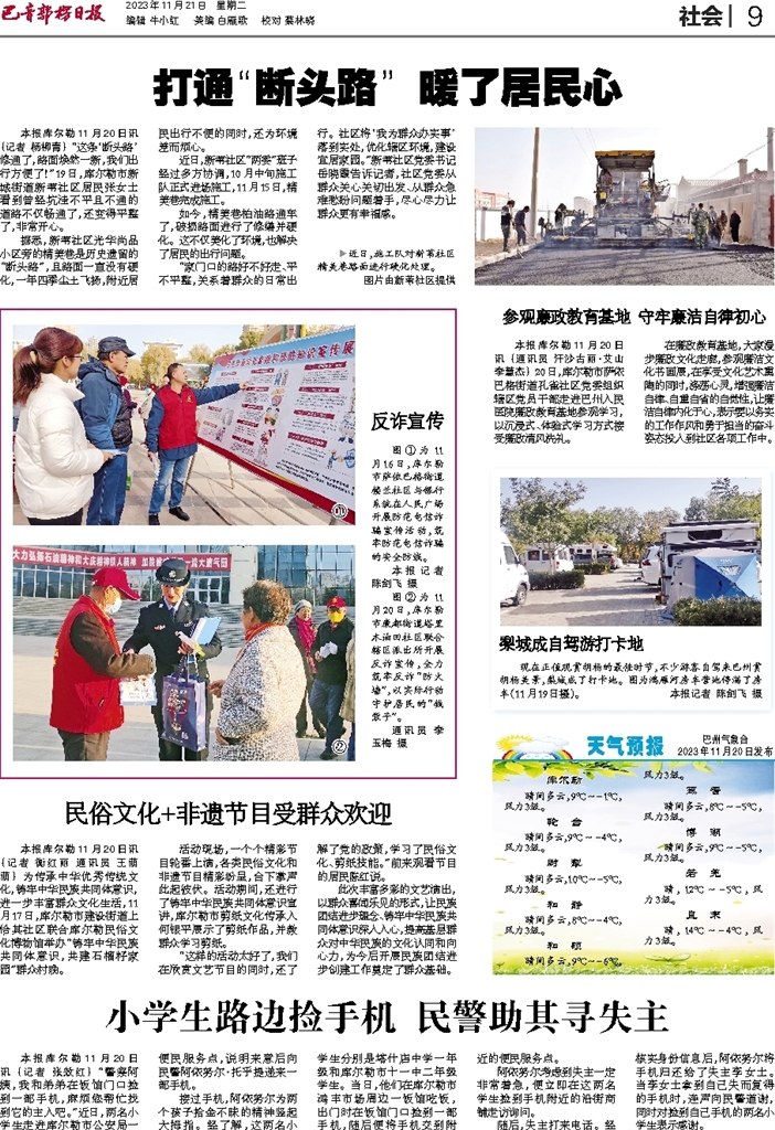 - 打通“断头路” 暖了居民心 本报库尔勒11月20日讯 (记者 杨柳青) “这条‘断头路’修通了,路面焕然一新,我们出行方便了!”19日,库尔勒市新城街道新苇社区居民张女士看到曾经坑洼不平且不通的道路不仅畅通了,还变得平整了,