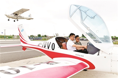 6月20日,在日照市东港区一家通用航空飞行培训基地,教练员(左)培训飞行学员。