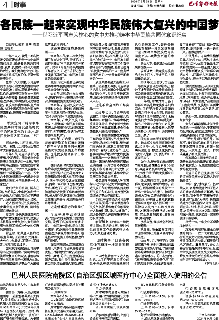 - 巴州人民医院南院区(自治区级区域医疗中心)全面投入使用的公告 尊敬的社会各界人士、广大患者朋友: 在自治州党委、人民政府坚强领导下,在社会各界关心支持下,经过精心谋划和充分准备,巴州人民医院南院区(自治区级区域医疗中心)于2024年9月26日全面投入使用