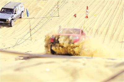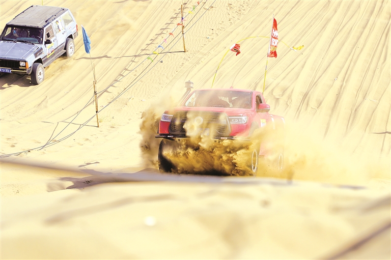 随着发车号令旗的挥动,参赛越野车两两一组冲出起点,在沙海中驰骋。不同型号的赛车如野马狂飙一般呼啸而过,伴随着震耳欲聋的引擎声,赛车轮胎高速旋转扬起的沙粒席卷整个车身。赛车手在浩瀚无际的沙漠赛道上比耐力、拼技巧,尽情体验沙漠越野的激情与乐趣。赛车时而压弯漂移,时而翻跳沙丘,扬起漫天沙尘,上演一幕幕惊险刺激的画面。