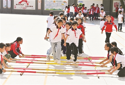 在梧州市平浪希望小学,学生们在体育大课间跳竹竿舞(10月25日摄)。