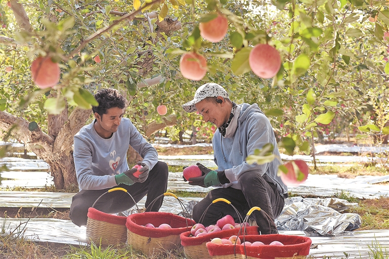 深秋时节,新疆阿克苏市近14万亩“冰糖心”苹果陆续成熟,进入采摘期,果农们忙着采摘、分拣、装箱。电商、物流企业深入田间地头,服务瓜果寄递销售,助力果农增收致富。