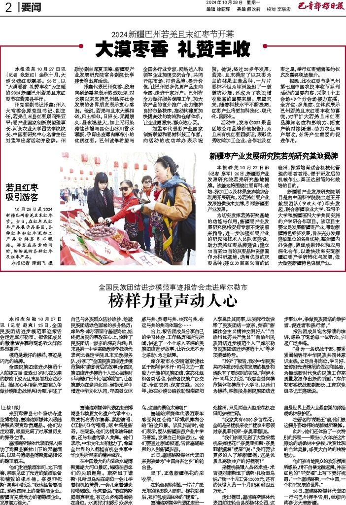 - 大漠枣香 礼赞丰收 本报若羌10月27日讯 (记者 张效红) 金秋十月,大漠戈壁红枣飘香。26日,以“大漠枣香 礼赞丰收”为主题的2024新疆巴州若羌且末红枣节在若羌县举行。 州党委副书记张鑫;州人大常委会原党组