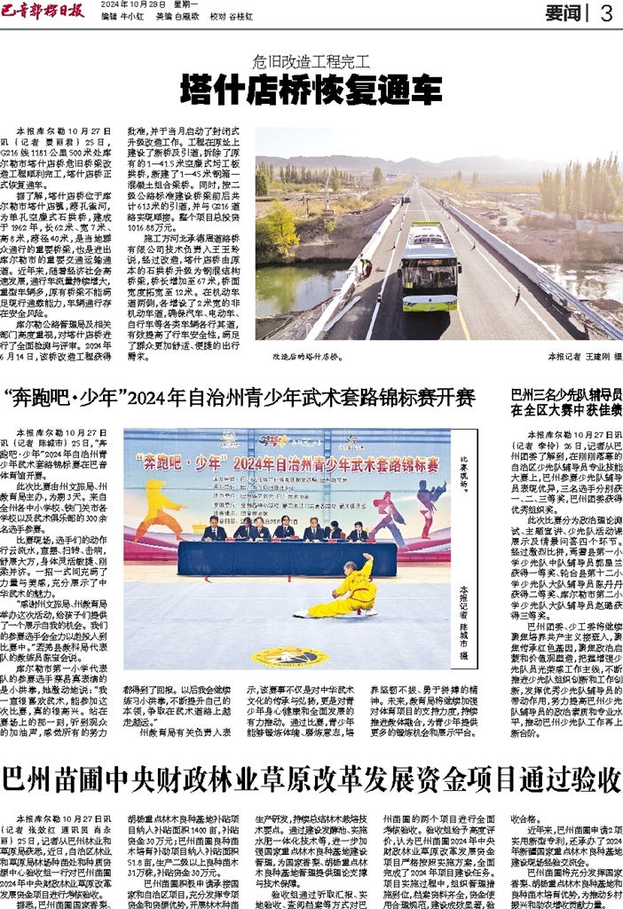 - 巴州苗圃中央财政林业草原改革发展资金项目通过验收 本报库尔勒10月27日讯 (记者 张效红 通讯员 肖永丽) 25日,记者从巴州林业和草原局获悉,近日,自治区林业和草原局林场种苗处和种质资源中心验收组一行对巴州苗圃2024年中央财政林业草原改革发