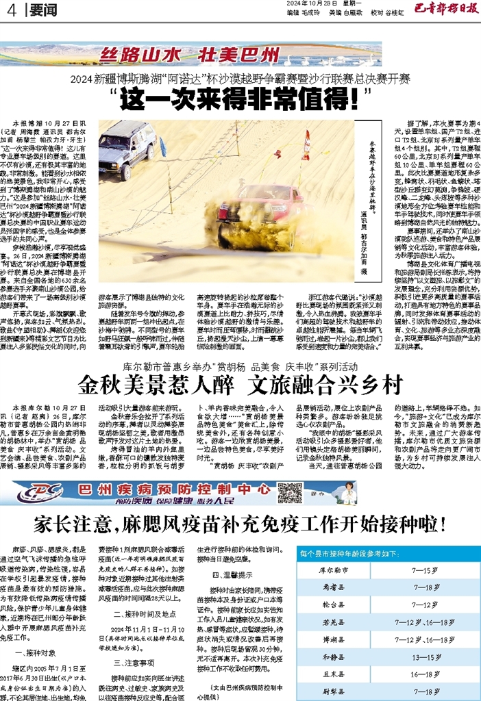 - 金秋美景惹人醉 文旅融合兴乡村 本报库尔勒10月27日讯 (记者 赵爽) 26日,库尔勒市普惠胡杨公园内热闹非凡,普惠乡在万余亩金黄明艳的胡杨林中,举办“赏胡杨 品美食 庆丰收”系列活动。文艺会演、品尝美食、农副产品展销、摄影采