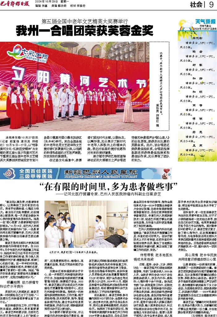 本报库尔勒10月27日讯 (记者 赵富强 通讯员 师哓红) 10月16日—17日,以“传承黄河文化·弘扬延安精神”为主题的第五届七彩夕阳黄河艺术节暨第五届全国中老年文艺精英大奖赛在陕西省延安市宜川