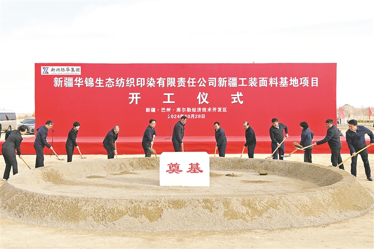 本报库尔勒10月28日讯(记者 杨晓东 特约记者 刘坤)10月28日上午,由新兴际华集团投资建设的新疆华锦生态纺织印染有限责任公司新疆工装面料基地项目在库尔勒经济技术开发区开工建设。自治区党委常委、自治区副主席玉苏甫江·麦麦提出席活动并宣布项目开工。新兴际华集团党委书记、董事长贾世瑞和自治区棉花产业发展领导小组办公室主任梁勇,自治区人民政府副秘书长袁玉荣出席活动。州党委书记任广鹏,新兴际华集团党委副书记、董事吴同兴出席活动并致辞。