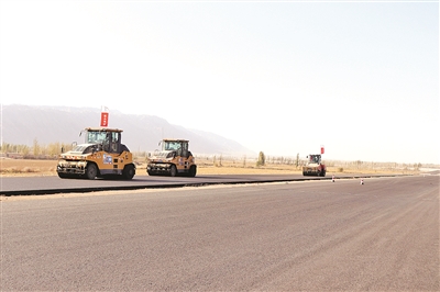 该标段项目经理部经理助理刘四军说:“此次摊铺的焉耆段路面沥青上面层长2000米,摊铺宽度11.25米、厚度4厘米,采用一次性成型设备摊铺机摊铺、碾压成型工艺。”