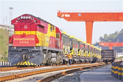 10月28日,装载“贵州造”新能源客车的出口专列停靠在贵阳国际陆港都拉营站。