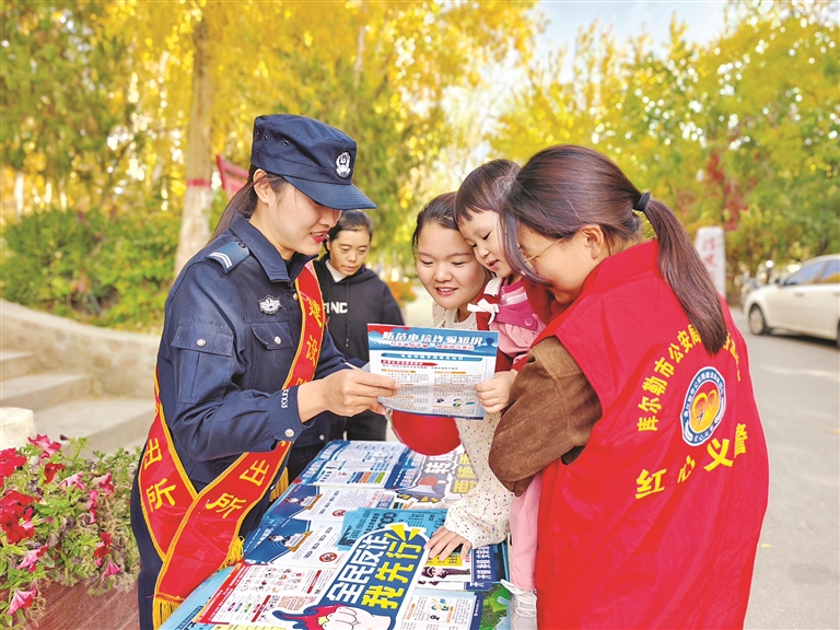 10月24日,库尔勒市龙山公园,“红心义警”向前来游玩的群众进行防范电信网络诈骗宣传。通讯员 王雪峰 摄
