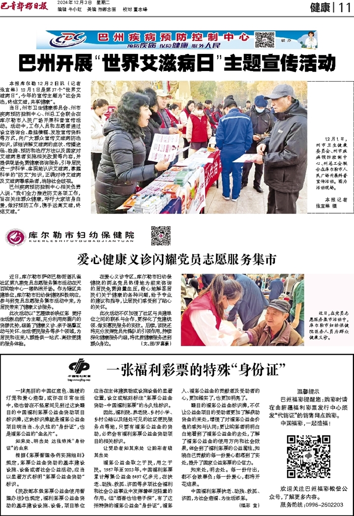 - 巴州开展“世界艾滋病日”主题宣传活动 本报库尔勒12月2日讯 (记者 张宜琳) 12月1日是第37个“世界艾滋病日”,今年的宣传主题为“社会共治,终结艾滋,共享健康”。 当日,州市卫生健康委员会、州市疾病预防控制中心、州总工会联合