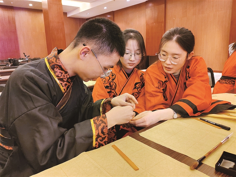 12月27日,巴州博物馆内洋溢着别样的节日气息,巴州文博院(博物馆)“‘简’述历史 ‘牍’懂中华”元旦简册编联主题社教活动欢乐开启,为群众呈上一份文化味十足的节前“大餐”,拉近大众与传统文化的距离,增加参与者的体验感,为传承中华优秀传统文化、厚植爱国主义情怀提供了良好的平台。图为参与活动的学生将写好的木简编排成册。本报记者 赵爽 摄