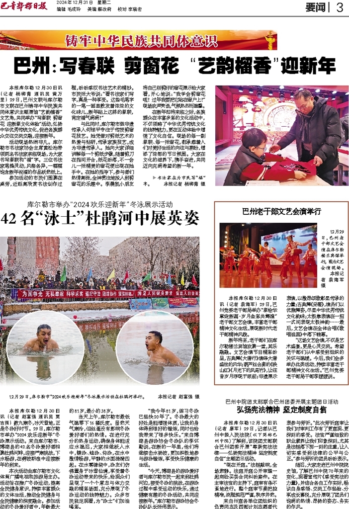 - 42名“泳士”杜鹃河中展英姿 本报库尔勒12月30日讯 (记者 赵富强 通讯员 贾吉雨) 数九寒冬,冰天雪地,正是冬泳好时节。29日,库尔勒市举办“2024欢乐迎新年”冬泳展示活动。来自库尔勒市、博湖县的42名冬泳爱好者相聚杜