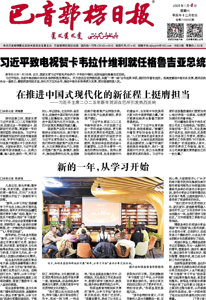 - 新的一年,从学习开始 □本报记者 陈彦强 凡是过往,皆为序章;勤学不辍,未来可期。迎着2025年的第一缕阳光,巴州广大党员干部群众开始了一段新的学习旅程。 “新年,从学习开始”是新疆学习平台自上线以来打